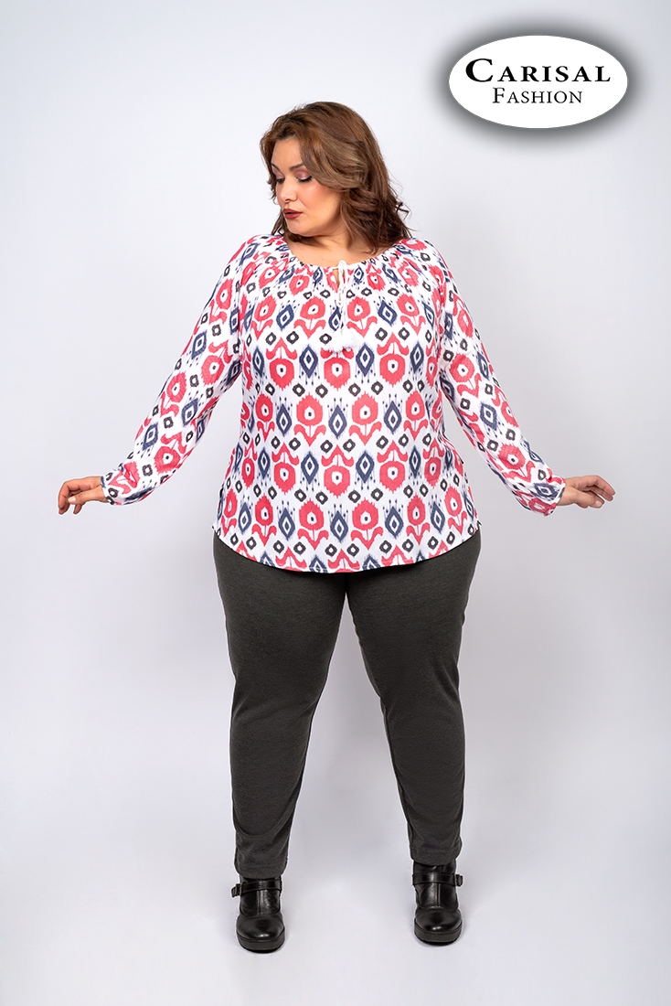 La Blusa con estampado y cordón en el escote es fácil de combinar con cualquier tipo de pantalón, aunque la opción que recomendamos es el modelo de punto milano de Carisal.