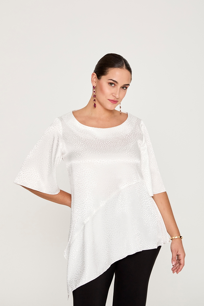 Blusa con el bajo asimetrico y evasé. El escote es redondo y la manga es ancha y hasta el codo.