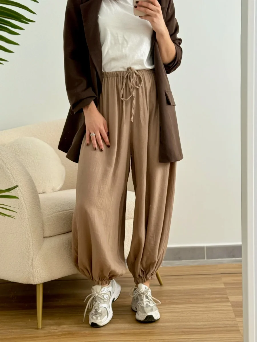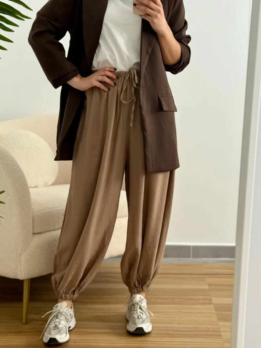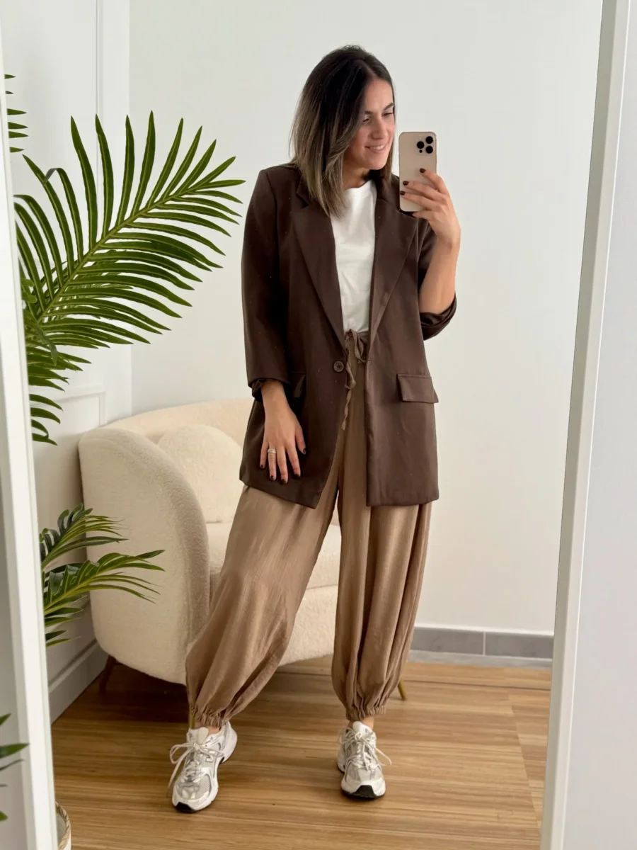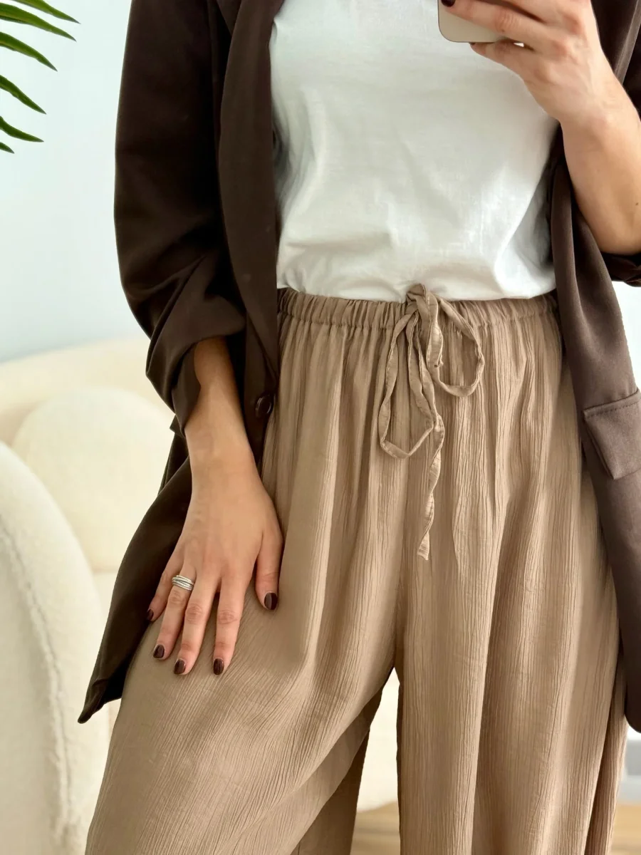 El pantalón Olivia es ese imprescindible que nunca falla, super tendencia esta temporada. Confeccionado en tejido ligero y vaporoso, su diseño de cintura elástica y bajo fruncido lo hace perfecto para el día a día, con un punto desenfadado pero favorecedor.
