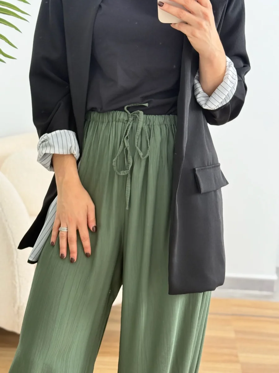 El pantalón Olivia es ese imprescindible que nunca falla, super tendencia esta temporada. Confeccionado en tejido ligero y vaporoso, su diseño de cintura elástica y bajo fruncido lo hace perfecto para el día a día, con un punto desenfadado pero favorecedor.