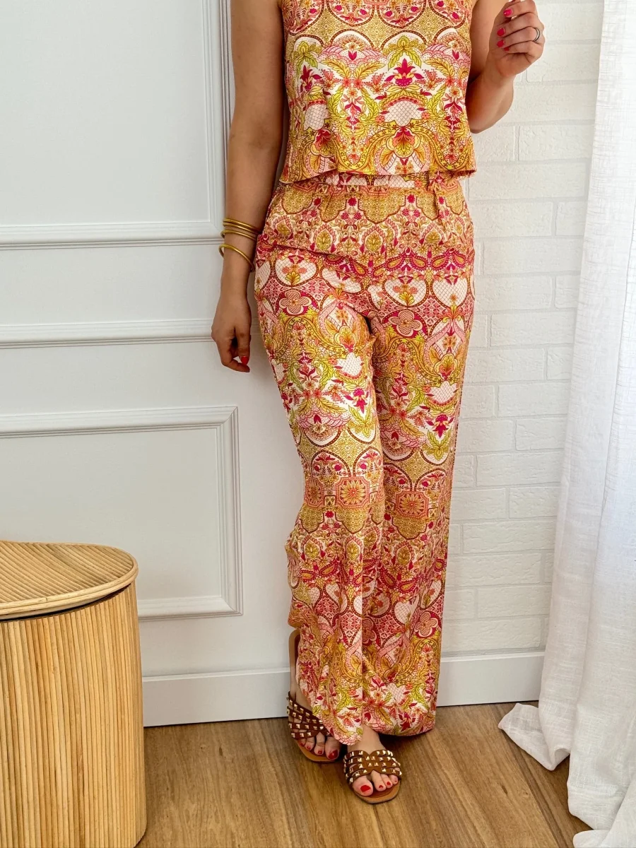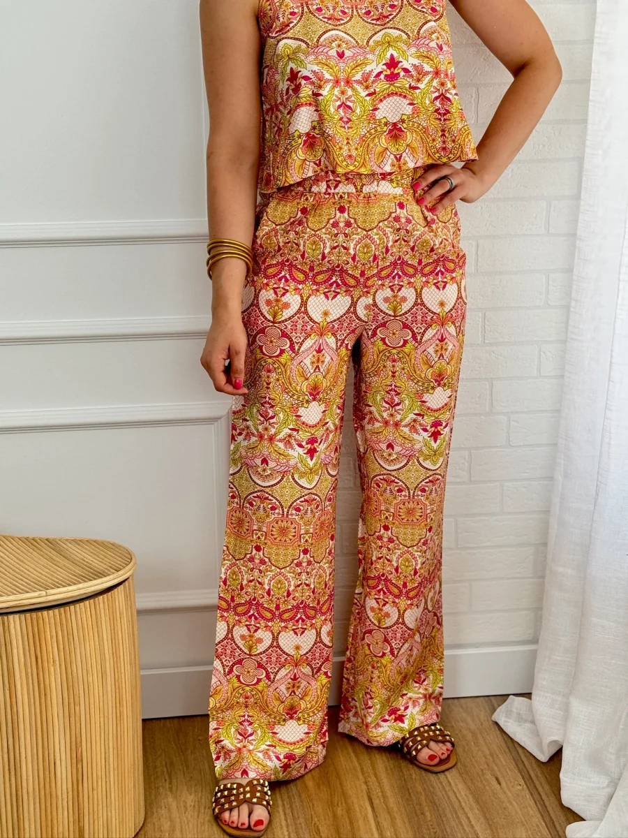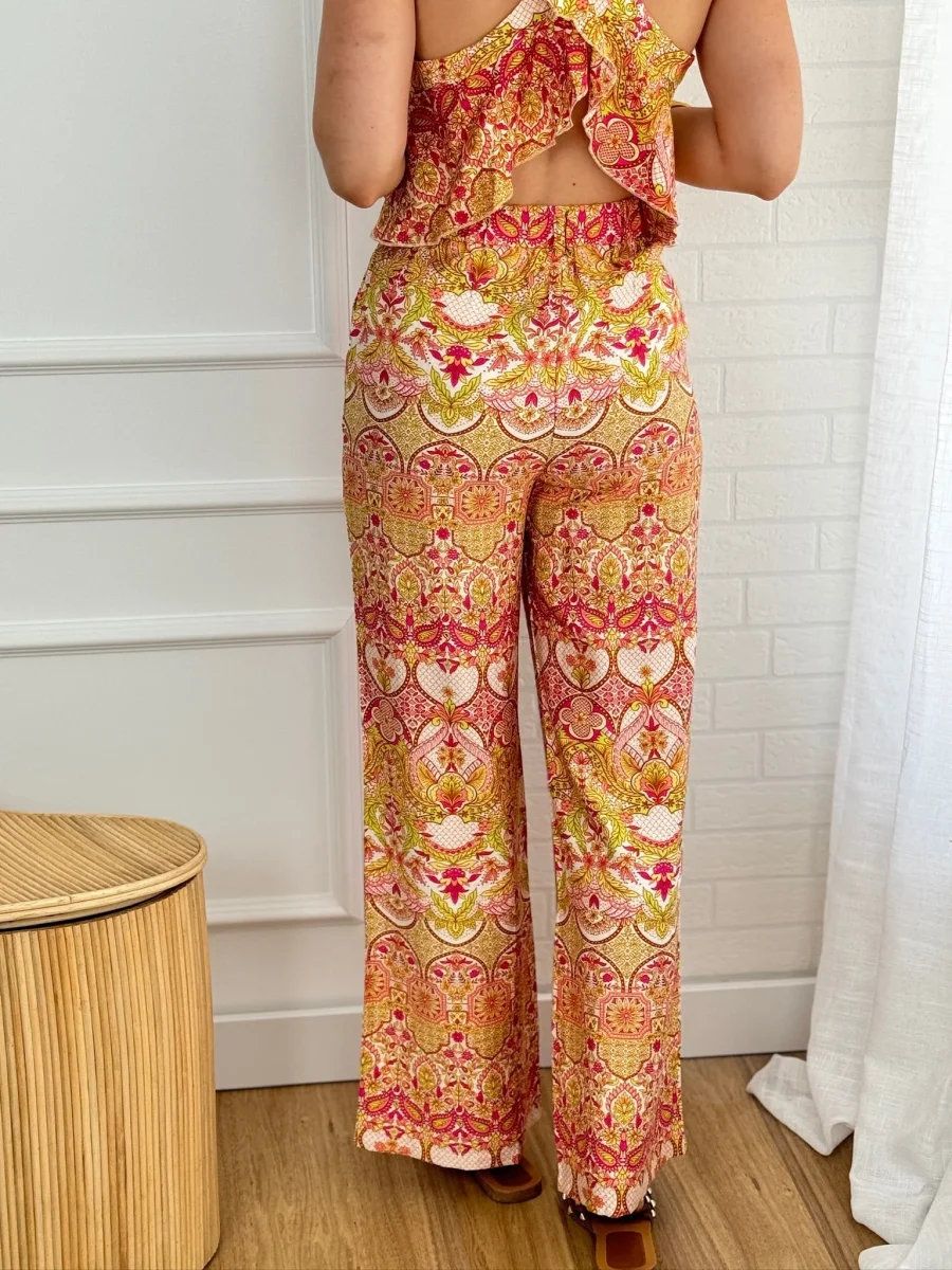 Pantalón de tejido fluido, multicolor ancho, cintura elástica, cierre con botón & cremallera delantera, bolsillos laterales.