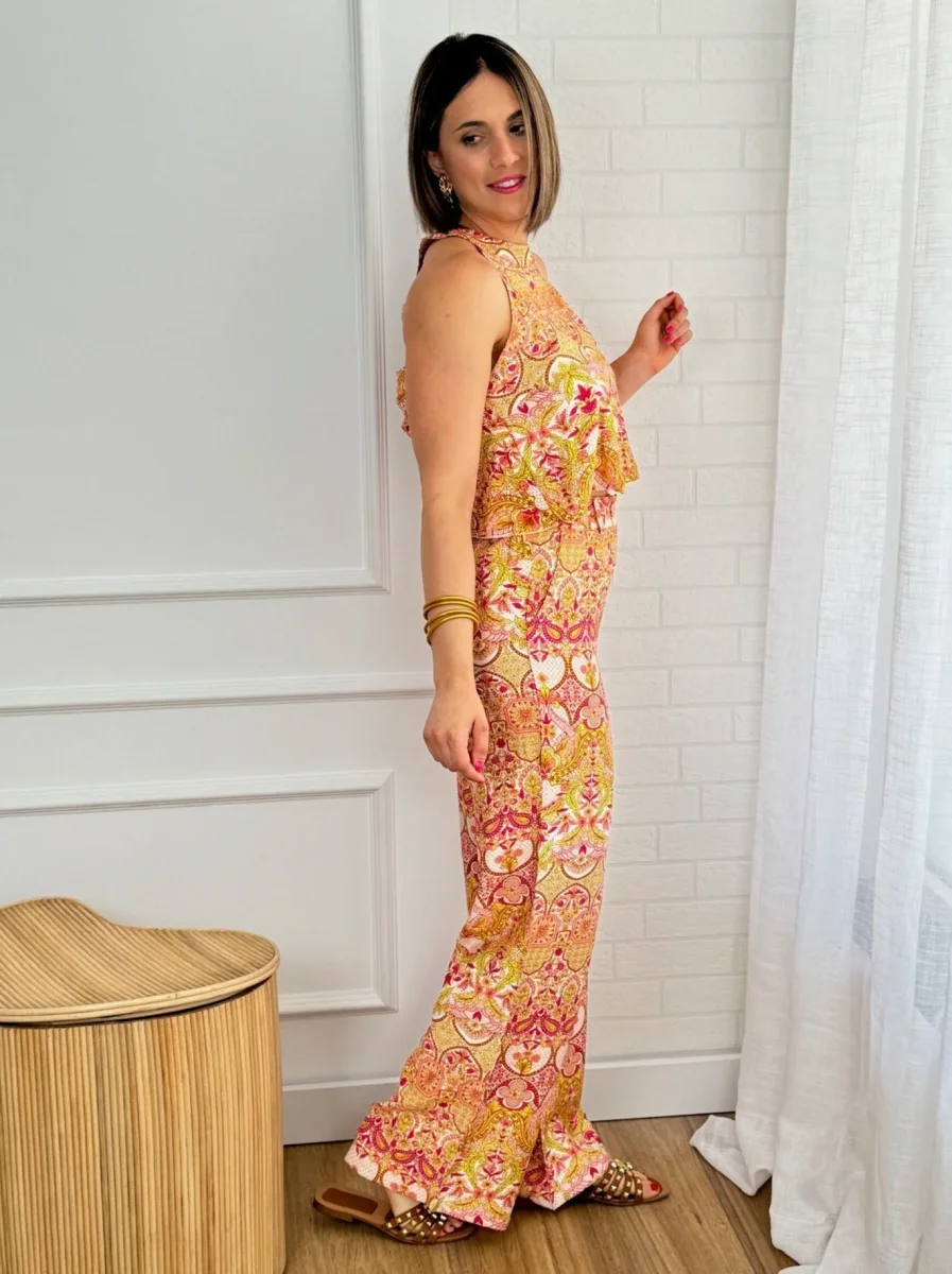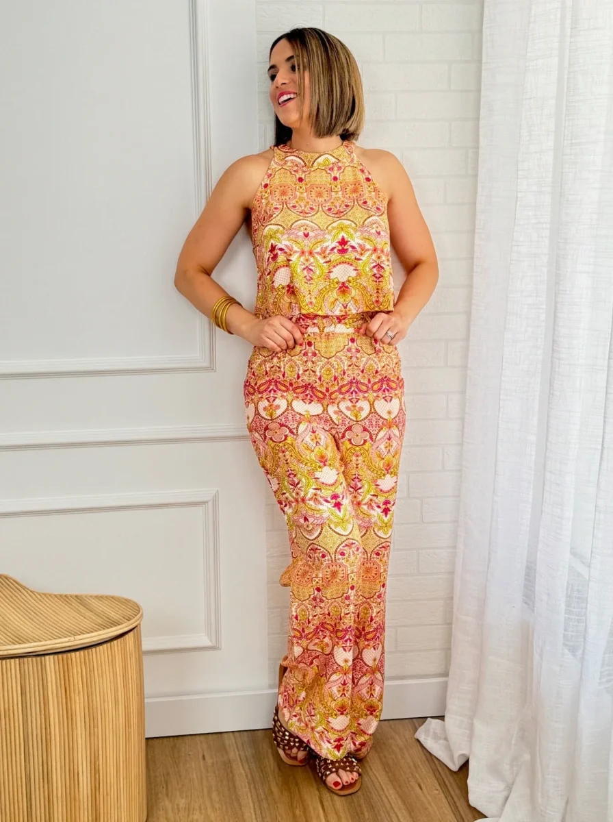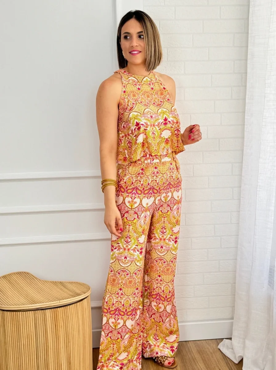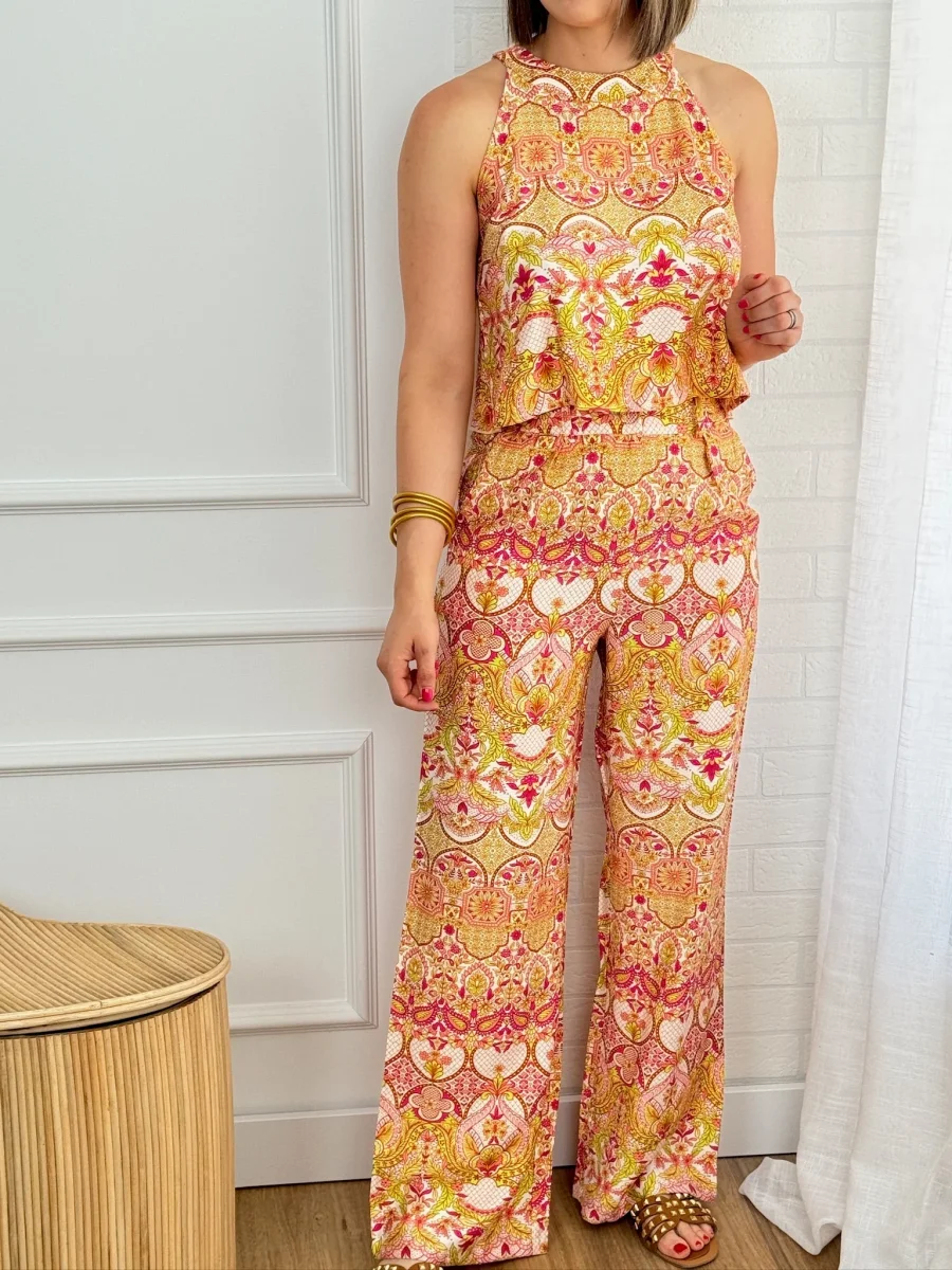 Pantalón de tejido fluido, multicolor ancho, cintura elástica, cierre con botón & cremallera delantera, bolsillos laterales.