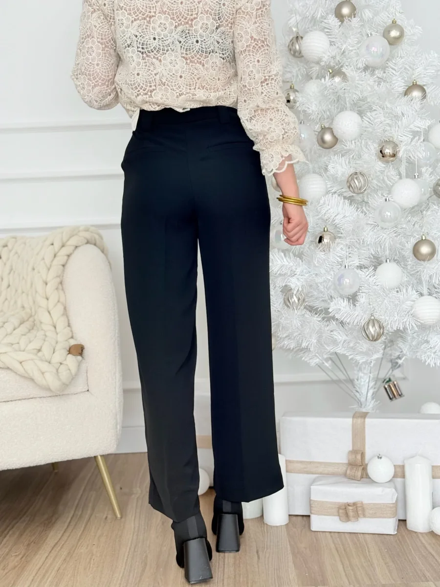 Pantalón de tiro alto con trabillas. Bolsillos laterales y de vivo en espalda. Detalle de pinzas. Cierre en delantero con cremallera y botón.